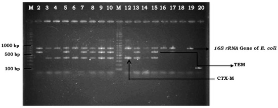 Extended spectrum beta lactamase (ESBL) genes detected using multiplex PCR assay: Lanes M: marker 100 bp ladder; Lanes 2 to 10, and Lanes 12 to 17: ESBL-producing E. coli isolates; Lane 18: negative control; Lane 19: E. coli ATCC 25922; Lane 20: K. pneumonia ATCC 700603.