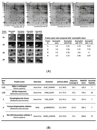 Briefly, following 30 min of infection with KP-M1, DT-X, and E. coli (as described above), neutrophils (4.5 × 106 cells) were collected after 6 h and then re-suspended in 50 µL of radioimmunoprecipitation assaybuffer(Cell Signaling Technology, Danvers, MA, USA) supplemented with a protease inhibitor at −80 °C overnight and centrifuged at 16,100× g for 20 min at 4 °C to obtain cell lysates. The supernatants were collected and the extracts were precipitated with a 2-D Clean Up kit (GE Healthcare, Chalfont St. Giles, UK) according to the manufacturer′s instructions.After discarding the cell debris, the supernatant protein concentrations were determined using the Bio-Rad Protein Assay Dye Reagent Concentrate (Hercules, CA, USA) [].