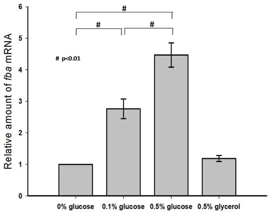 KP-M1 strains were cultured in LB broth alone or in LB broth supplemented with 0.1% glucose, 0.5% glucose, and 0.5% glycerol, and the mRNA levels of fba were measured by qRT-PCR. No statistical difference in the transcription of fba was observed between these growth conditions of LB broth alone and LB broth supplemented with 0.5% glycerol. However, growth in LB broth supplemented with 0.5% glucose increased the transcription of fba in a dose-dependent manner compared with growth in LB broth alone or in LB broth supplemented with 0.1% glucose (Figure 3).