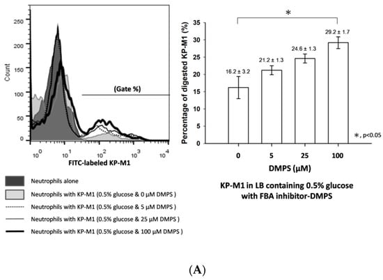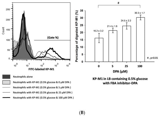 The KP-M1 bacteria were cultured 6hat 37 °C on LB medium containing 0.5% glucose (with 5 μM, 25 μM or 100 μM of 2,3-dimercaptopropanesulfonate (DMPS, SIGMA, Duren, Germany #SI-D8016) or the metal-chelating compound dipicolinic acid (DPA, SIGMA, New Delhi, India #FL-02321) and control with PBS) []. The bacterial colonies were irradiated with UV light for bacterial inactivation, followed by sub-culture in plates to confirm sterility after overnight incubation. The purpose of inactive bacteria colonies is to keep a consistent MOI (10:1) for the phagocytosis assay. The irradiated cultures were resuspended in carbonate buffer containing 0.1% fluorescein isothiocyanate (FITC). The FITC-stained KP (FITC-KP) cells were counted using a bacterial cytometer and a fluorescence microscope. Phagocytosis was measured using a standard assay []. With the technique, FITC-unstained (adherent) and FITC-stained (intracellular) bacteria can be quantitated. The percentage of ingested bacteria was counted at 60 min. Briefly, 10 μL of FITC-KP (representing 5 × 108 cfu/mL) was added to each 990 μL volume containing a mixture of 100 μLof a neutrophil suspension (representing 5 × 106 cells/mL), 100 μL of pooled normal human serum (10% v/v for opsonization), and 790 μL of PBS. The final volume was 1.0 mL and the multiplicity of infection was 10:1. Each tube was incubated in a shaking water bath at 37 °C and transferred to an ice bath at a designated time point. A FACScan emitting an argon laser beam at 488 nm was used to detect FITC fluorescence. A total of 20,000 cells were processed using Cellquest version 1.0 software (Becton, Dickinson and Company, Franklin Lakes, NJ, USA). Green fluorescence (FL1-H) intensity data (collected using a logarithmic amplifier) were displayed as single histograms. By processing phagocytosis mixtures of unstained and FITC-stained bacteria, the boundary of positive and negative fluorescence was determined and the percentage of ingested bacteria was assessed.