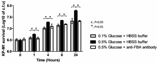 Bactericidal activity was measured using a standard assay method []. The KP-M1 (1 × 107 cfu/mL) samples were cultured in LB broth containing 0.1% or 0.5% glucose, respectively, then opsonized with pooled human 10% serum and added to human neutrophils either in the presence or absence of 0.1 mg anti-FBA antibody at a multiplicity of infection of 10:1 for 30 min. Post-infection, samples (50 μL) were withdrawn at 0, 1, 4, 6, and 24 h separately then diluted with 2.45 mL of H2O (pH 11.0, adjusted by NaOH) to lyse the neutrophils and disperse the bacteria sufficiently to permit evaluation by a colony assay []. All tests were performed in triplicate to ensure reproducibility.