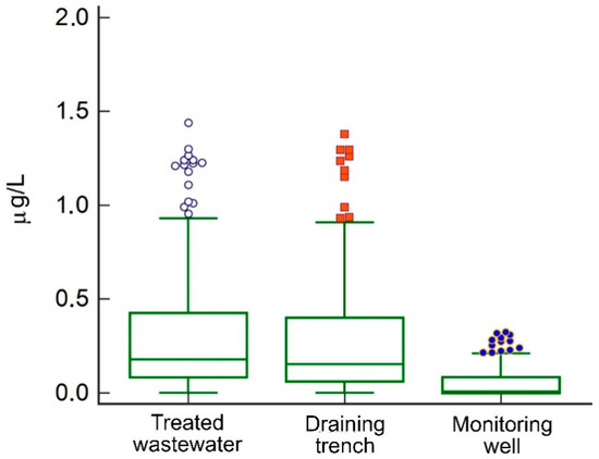 A total of 750 determinations, 250 at each investigated site, were carried out during the monitoring period. In Figure 1, a box and whisker plot shows the distribution of the concentration values of the substances in the treated wastewater (highest value 25.4 μg/L, arithmetic mean 0.74 μg/L, median 0.17 μg/L, SD 2.29 μg/L), infiltration trench (highest value 28.8 μg/L, arithmetic mean 0.78 μg/L, median 0.20 μg/L, SD 2.15 μg/L), and monitoring well (highest value 2.04 μg/L, arithmetic mean 0.12 μg/L, median 0.02 μg/L, SD 0.26 μg/L), after the elimination of the far out values identified by the Tukey test. The data did not follow a normal distribution in any of the groups.