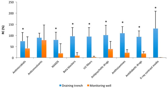 Average residual concentration (RC) and standard deviation of substances in the infiltration trench and monitoring well grouped by pharmacological category (* p < 0.05 calculated by Student’s t-test; ^nonsteroidal anti-inflammatory drugs).