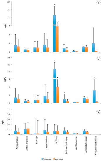 Average seasonal concentrations and standard deviation of emerging pollutants, grouped by pharmacological category, in the treated sewage (a), draining trench (b), and monitoring well (c). * p < 0.05 calculated by the Kruskal–Wallis test.