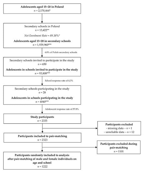 On the basis of the described procedure, 2323 secondary school students were recruited and participated in the study. The obtained sample was stated to be population-based because the procedure involved the recruitment of the adolescents from all the regions of Poland, while the Net Enrollment Rate (NER) for this age group is calculated as 89.38%, according to the data of Polish Central Statistical Office (CSO) [].