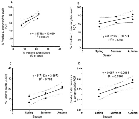 L. pneumophila showed an increase in biofilm samples from spring to autumn across all sampling sites. Both culture- and PCR-based methods showed this tendency (Figure 1). For PCR-based detection, the percentage of positive swabs was in general higher than for culture-based detection. Culture-based methods and L. pneumophila-specific PCR-based methods showed a good correlation (r2 = 0.83, Figure 1A; correlation with Legionella genus-specific PCR: r2 = 0.78). The relative increase was higher for culture from spring to autumn (increase from about 10 to 20% of positive swabs, Figure 1C) compared to the PCR-based detection (increase from about 60 to 80% of positive swabs, Figure 1B). The comparison of culture-based and PCR-based detection of L. pneumophila indicated an increase of culturability of L. pneumophila from biofilm from spring to autumn (and the respective exposure to higher temperature) from about 15% in spring to about 27% in autumn as shown by the respective ratios (Figure 1D).