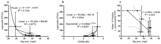 (A) PCR-based detection of the genus Legionella (p < 0.05) and (B) L. pneumophila in biofilm swabs vs. magnesium concentration in bulk water (p < 0.05) (n = 45, mean values n = 8).