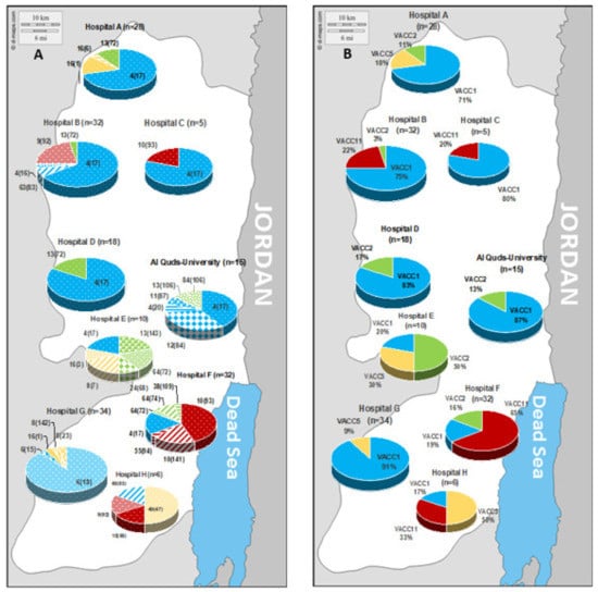 The biogeographic distribution of the strains according to their MLVA-genotype and clonal VNTR complex (VACC) is indicated in Figure 6. On the genotype (Gt) level, Figure 6A shows a genotype pattern that varied on the regional level. In the north of the West Bank, Gt 4(17) was highly prevalent. In the south, the pattern showed high divergence from site to site. For example, site G is dominated by Gt 6(18) that was not retrieved from any other site; similarly, site F showed a high prevalence of Gt 10(141) that was endemic for this site. Furthermore, on the level of the clonal complexes the regional variability was well pronounced (Figure 6B). In general, there was a high prevalence of VACC1 in the West Bank, except for sites E, F, and H in the south. Site F showed a high prevalence of VACC11, site E for VACC 2, and site H for VACC 5.