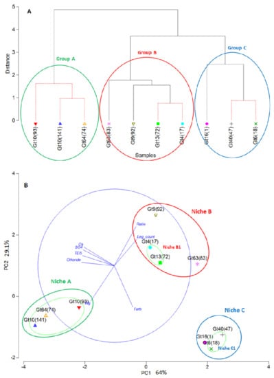 The three groups of genotypes were considered to co-occur in their respective environment as described by the above-mentioned parameters. The respective habitats as described by these environmental parameters for the three groups of genotypes could be considered as their “niche”. This means that to each niche three to four genotypes were assigned. More genotypes may be sharing these niches, but they were not included in the analysis due to the low number of strains per genotype.