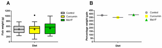 Effect of curcumin- and MsYF-based diets on fish weights. (A) Common carp (Cyprinus carpio) body weight at the end of the 106-day trial (two months of feeding and 1.5 months of infection with S. molnari). Mean values are indicated by a “+” sign, medians by a line. (B) Average percentage of weight gain of non-infected fish during the 106-day trial.