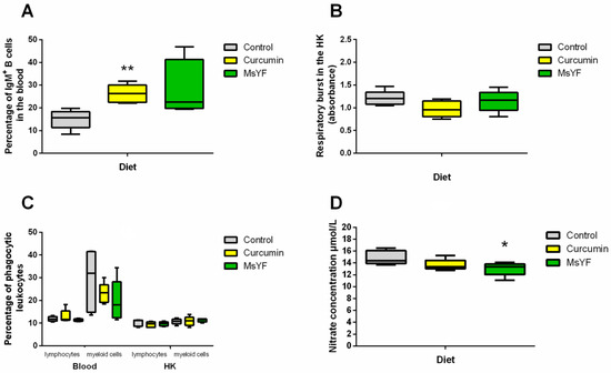 Firstly, we aimed at elucidating the impact of the functional feeds on the innate and adaptive immunity of common carp, prior to the infection with S. molnari. We observed a marked increase in the proportion of IgM+ B cells in the blood in fish fed both experimental feeds, with 10.7% and 7.0% higher median values for curcumin and MsYF, respectively, in comparison to the control. However, the values reached statistical significance only in the group of fish fed curcumin (p < 0.01), showing lower dispersion compared to MsYF (Figure 2A). We observed a marginal reduction in respiratory burst in curcumin-fed fish in comparison to the control (Figure 2B) and a minor effect on the phagocytic properties of fish leukocytes in blood or head kidney (HK) (Figure 2C). Similarly, both curcumin and MsYF reduced NO secretion in the head kidney leukocytes of naïve fish in comparison to the control slightly; however, the results reached statistical significance only in the MsYF-supplemented group (p < 0.05) where median nitrate concentration was 13.4 µmol/L in comparison to 14.4 µmol/L in the control group (Figure 2D). Taken together, these data suggest only a subtle impact of the enriched feeds on innate immune parameters in naïve fish, while IgM+ B cell numbers increased considerably.