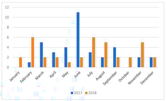 There were no differences between the number of cases of DEC in 2017 and 2018 (37 cases each year). The distribution of the cases was homogeneous throughout the months of the 2 years, with three exceptions (January and October 2017—0 cases, and June 2017—11 cases) (Figure 1).
