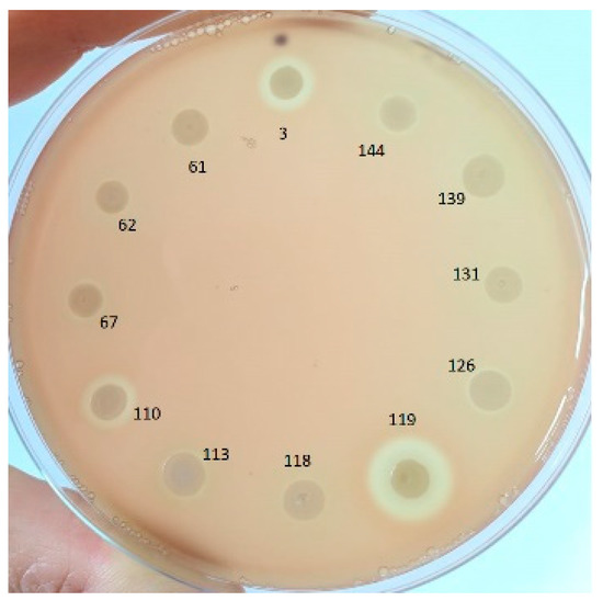 The hemolytic activity was detected following a previously published protocol, on sheep blood agar (5% defibrinated erythrocytes, washed in PBS—phosphate-buffered saline, pH 7.4), supplemented with 10 mM calcium chloride [46]. The bacterial strains were cultured overnight in tryptic soy broth. Two microliters of the homogenized liquid culture were spotted on the blood agar plates. After 24 h of incubation at 37 °C, the presence of hemolysis surrounding the bacterial culture was visually examined.