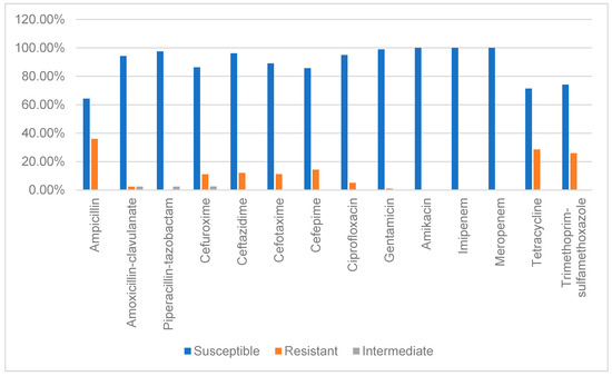 All the tested strains fully preserved their susceptibility to carbapenems. The same situation was observed in the case of the third-generation aminoglycosides (amikacin); in terms of the first generation of aminoglycosides (gentamicin), only one strain was resistant. For the combination of beta-lactam antibiotics and beta-lactamase inhibitors, the sensitivity rates were over 94%. The sensitivity to cephalosporins was lower, between 85.7% (cefepime) and 96.2% (ceftazidime). The highest rates of resistance were reported in the case of ampicillin (36.1%), tetracycline (28.6%), and trimethoprim/sulfamethoxazole (25.9%) (Figure 4). Ten percent (13) of the tested strains were extended-spectrum beta-lactamase producers. The multidrug-resistant (MDR) strains represented 24% of the strains included in our study. All the hlyA-positive strains were fully susceptible to all tested antibiotics, except for one strain (119), which was an MDR strain.