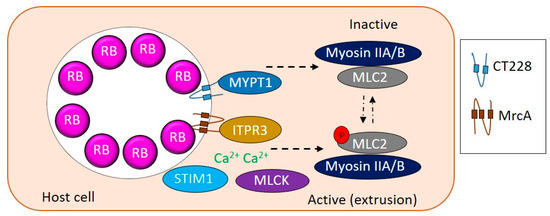 CT228 and CT101/MrcA have been shown to regulate extrusion via the myosin phosphatase pathway (Figure 1) [28,29,30]. CT228 binds to and recruits MYPT1 to the chlamydial inclusion [28,30]. MYPT1 phosphorylated at residues T853 and T696 colocalizes with active SFK laden microdomains along with other proteins of myosin pathway, Myosin light chain 2 (MLC2), Myosin light chain kinase (MLCK), and the heavy chains, Myosin IIA and B [28]. siRNA mediated depletion of MLCK, MLC2, Myosin IIA and B resulted in decreased extrusion production by C. trachomatis [28]. MrcA binds to the inositol 1,4,5-triphosphate receptor 3 (ITPR3) which works with stromal interaction molecule 1 (STIM1) to regulate Ca2+ release, ensuring MLCK is active and phosphorylates MLC2 to regulate extrusion [28,29]. Overall, a complex interplay between MLCK and a phosphatase at the SFK microdomains regulates chlamydial exit strategies and determines whether C. trachomatis exits the host via lysis or extrusion.