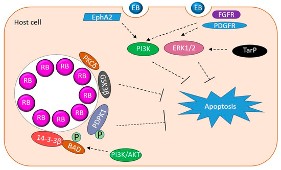 Host kinases manipulated by Chlamydia to promote survival. Schematic contains a summary of host kinases manipulated by Chlamydia to inhibit apoptosis. EB binding and entry activate PI3K and ERK1/2 to promote survival. TarP activates Erk1/2. Sequestration of PKC, 14-3-3β, PDPK1, and GSK3β work via different mechanisms to prevent apoptosis.