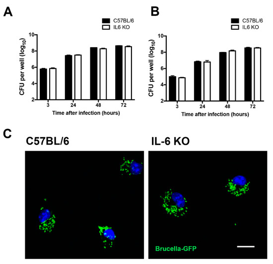 Interleukin (IL)-6 is not involved in B. abortus intracellular growth in macrophages. Macrophages derived from wild-type (C57BL/6) and IL-6 KO mice were infected with B. abortus for 3, 24, 48, or 72 h. (A) Residual CFU in macrophages derived from wild-type and IL-6 KO mice infected with B. abortus with MOI = 100:1. (B) Residual CFU in macrophages derived from wild-type and IL-6 KO mice infected with B. abortus MOI 10:1. (C) Macrophages derived from wild-type (C57BL/6) and IL-6 KO mice were infected with B. abortus–GFP (MOI = 100:1). Fluorescence microscopy analysis of B. abortus–GFP replication 24 h post-infection. Images are representative of all experiments analyzed. GFP-expressing bacteria are shown in green (Brucella–GFP) and 4’,6-diamidino-2-phenylindole (DAPI) (DNA) is in blue. Scale bar = 30 mm. Data are representative of three independent experiments.