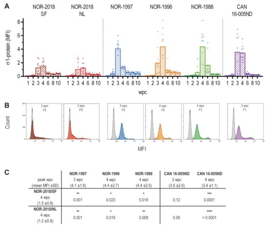 PRV σ1-protein in blood cells. (A) Amount of σ1-protein in blood cells measured by flow cytometry from 1 to 10 weeks post challenge (wpc), shown as mean fluorescence intensity (MFI) for individual fish and group mean for NOR-2018/SF (dark red), NOR-2018/NL (red), NOR-1997 (blue), NOR-1996 (orange), NOR-1988 (green) and CAN 16-005ND (purple). (B) Histogram from one individual fish at peak of infection from each group, MFI for σ1-protein on X-axis and cell count on y-axis, counting 30,000 cells per sample. Color coding as above, overlaid PRV negative control fish (grey). (C) Statistical analysis comparing mean MFI at peak of infection (mean MFI ± SD shown) for the NOR-2018/SF and NOR-2018/NL, to that of NOR-1997, NOR-1996, NOR-1988 and CAN 16-005ND using Mann-Whitney test, results shown as p-values (* p < 0.05, ** p < 0.01, *** p < 0.001, **** p < 0.0001).