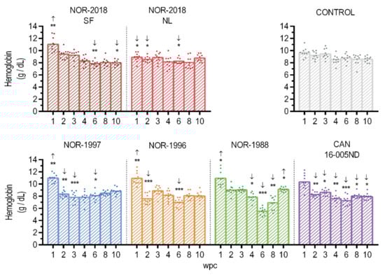 Hemoglobin. Concentration of hemoglobin presented as individual and mean value from 1 to 10 weeks post challenge (wpc). Statistical analysis comparing each isolate (color coded) to the control (grey) at each time point using Mann-Whitney test. Significant differences presented as * p < 0.05, ** p < 0.01, *** p < 0.001, including arrow showing if it was higher (up) or lower (down) compared to the control group.