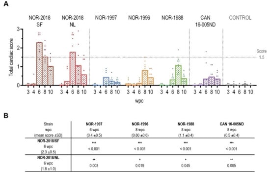 Heart histopathology scoring. (A) Total cardiac score shown as individual score and group mean from 3 to 10 weeks post challenge (wpc) for the six different PRV groups (color coded) and the control group (grey) (n = 10). Horizontal dotted line marks score 1.5. (B) Statistical analysis comparing mean total cardiac score at peak of infection of NOR-2018/SF and NOR-2018/NL to that of NOR-1997 NOR-1996, NOR-1988 and CAN 16-005ND using Mann-Whitney test, results shown as p-values (* p < 0.05, ** p < 0.01, *** p < 0.001).