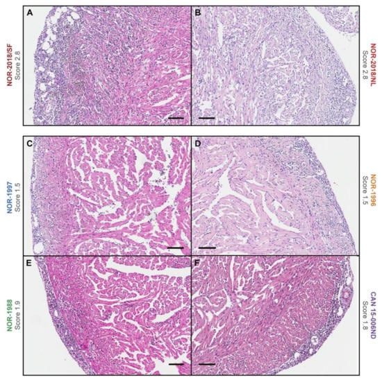 Heart histopathology. Histopathology image of the heart with the highest cardiac score observed in each group, including (A) NOR-2018/SF, (B) NOR-218/NL, (C) NOR-1997, (D) NOR-1996, (E) NOR-1988 and (F) CAN 16-005ND. Total cardiac score shown next to group title. Scale bar 100 μm.