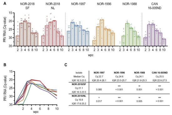 PRV RNA in heart by RT-qPCR. (A) PRV RNA in heart measured by RT-qPCR, shown as individual and median Cq-values from 2 to 10 weeks post challenge (wpc), (B) also shown as line graph with median Cq-values. (C) Statistical analysis comparing median Cq-values at peak RNA loads in heart for NOR-2018/SF and NOR-2018/NL to that of NOR-1997 NOR-1996, NOR-1988 and CAN 16-005ND using Mann-Whitney test, results shown as p-values (* p < 0.05, ** p < 0.01, *** p < 0.001).