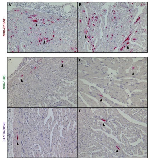 PRV detection in cardiomyocytes. Detection of PRV RNA by in-situ hybridization in cardiomyocytes after infection with NOR-2018/SF (A,B), NOR-1988 (C,D) and CAN 16-005ND (E,F). Positive staining observed as red staining and marked by arrowheads. Images of compactum and spongiosum layer presented in left (A,C,E) and spongiosum layer on the right side (B,D,F).