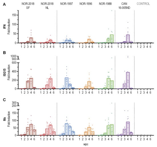 To compare the innate antiviral response in blood cells after infection with the different PRV-1 isolates, the expression of a selection of innate immune genes were assessed by RT-qPCR. No substantial differences in expression levels were observed between the two Norwegian 2018 isolates, historical Norwegian (NOR-1997, NOR-1996, NOR-1988) or the Canadian isolate. In general, transcription of type I interferon (primers targeting IFNab), interferon-stimulated gene 15 (ISG15) and myxovirus resistance GTPase (Mx1) was up-regulated at 3–4 wpc in all groups and reduced at 6 wpc (Figure 8). The three innate antiviral genes followed a similar expression pattern and the up-regulation coincided with the peak of infection in each group.