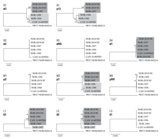 Multiple sequence alignments were performed using MUSCLE [36] and MEGA X software v10.1.7 (available from www.megasoftware.net) [37]. Phylogenetic analyses were performed with MEGA X using full-length sequences from all ten gene segments and the eleven proteins known to be encoded by PRV-1. Maximum likelihood (ML) was used to generate the phylogenetic trees from gene segment sequences and neighbor joining (NJ) for the amino acid sequences, using the best-fitting substitution models suggested by the program. PRV-3 NOR/060214 (MG253807–MG253816) was selected as outgroup in all trees. Bootstrap values were calculated from 1000 replicates and values above 70 were considered significant [20].