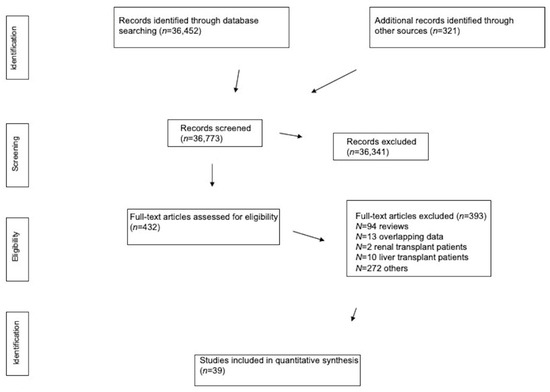 Our electronic and manual searches identified 432 full-text articles that were considered potentially relevant and selected for full-text review. A complete list of the 432 full-text articles reviewed is available from the authors on request. We excluded 393 full-text articles, as detailed in Figure 1.