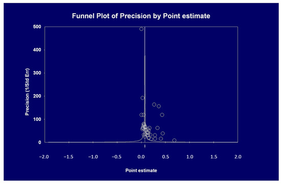 Table 5 shows that the summary estimate for the occurrence of AKI across the identified trials was 0.154 (95% CI, 0.107, 0.201). Significant heterogeneity was found (Table 5) (p = 0.0001). The Egger’s regression intercept shows that there was publication bias (p = 0.025) (Figure 2).