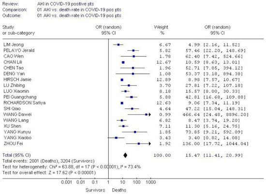 The pooled OR of AKI incidence was greater in deceased COVID-19-positive patients than among survivors during their hospital stay, 15.4 (95% CI, 20.99; 11.4) (random-effects model).