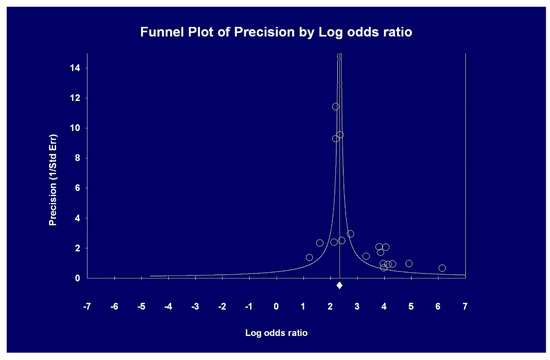 The pooled OR of AKI incidence among deceased COVID-19 positive patients was greater than among survivors, 15.4 (95% CI, 20.99; 11.4). Test for heterogeneity was significant (p = 0.00001) (Figure 5). Publication bias occurred (Egger’s regression, p = 0.0016) (Figure 6).
