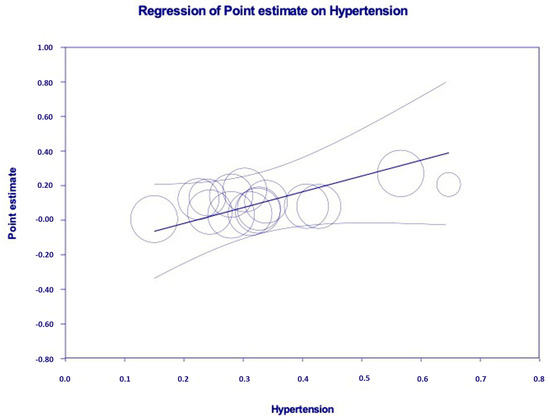 Some authors (n = 5, n = 5435 unique patients) evaluated the association between AKI and death risk by multivariate analysis. As shown in Table 6, the link between AKI and death risk remained significant in many comparisons. The results of meta-regression are reported in Table 7. Age (p = 0.007) and arterial hypertension (p = 0.001) are significantly associated with the frequency of AKI. The independent and significant relationship between the frequency of AKI and arterial hypertension according to meta-regression is shown in Figure 7.