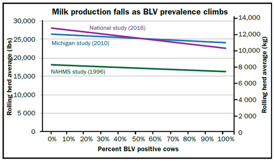 BLV-infected dairy cattle may reduce milk production and shorten cow lifespan [18,22]. The impact of BLV infection on milk production has been difficult to measure, since cows which drop in production are usually quickly removed from the herd. Oftentimes, cows that are still present, but designated to be culled, are often excluded from herd production calculations. Some have reported that infected cattle make more milk than BLV-negative cattle [23], or about the same [20,24,25]. However, most researchers have found BLV infection to be associated with lower milk production [1,16,19,26,27,28,29]. In addition, for every 10% increase in BLV prevalence, a loss of 115 kg in rolling herd average was observed [29]. Three large studies (Figure 1) showed a dose-response between rolling herd average milk production and herd BLV prevalence.