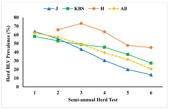 Decrease in herd BLV prevalence among three herds, culling or segregating those cows with the highest lymphocyte counts and/or BLV proviral loads, from Ruggiero [63].