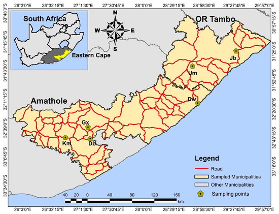 The map showing the geographical locations of the sampling sites with their coordinates; Debe (Db) = 32°52′11.852″ S, 27°1′14.171″ E; Gxulu (Gx) = 32°40′26.702″ S, 27°6′19.591″ E; KwaMemela (Km) = 32°47′38.497″ S, 26°44′10.889″ E; Dwesa (Dw) = 32°13′50.916″ S, 28°51′16.135″ E; Umtata (Um) = 31°39′26.69″ S, 28°48′0.194″ E; Jambini (Jb) = 31°23′36.856″ S, 29°29′46.921″ E. Map created using ArcMap 10.5.1.(ArcGIS, Esri, Redlands, CA, USA)