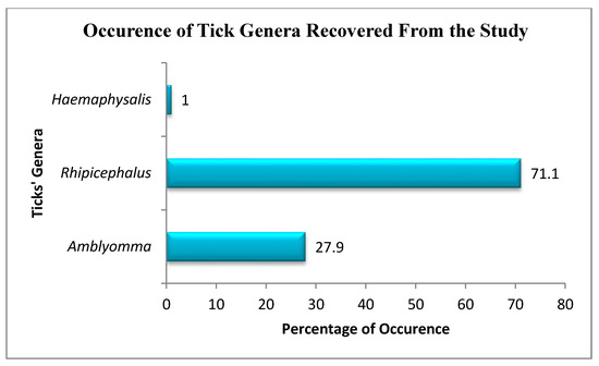 The prevalence of tick genera collected in the study. The figure shows the overall prevalence of tick genera collected at all the sampling sites.