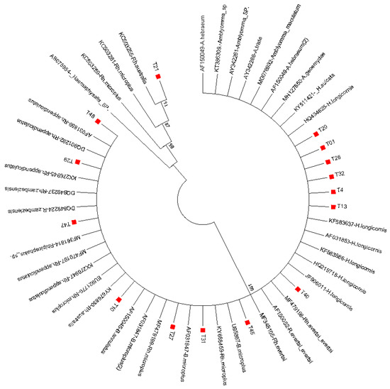 Phylogenetic analysis of generated tick sequences showed that the three genera, Rhipicephalus, Amblyomma, and Haemaphysalis, that were initially identified through morphologic criteria clustered with respective corresponding species of the reference sequences. Sequence T21 clustered in one clade with reference sequences KC503255-Rh. australis, KC503261-Rh. microplus, KC503259-Rh. microplus, and AB075954-Haemaphysalis sp. Additionally, sequences T29, T48, and T29 clustered closely with reference strains AF031859-Rh. appendiculatus, DQ801282-Rh. appendiculatus, KX276945-Rh. appendiculatus, DQ849237-Rh. zambeziensis, DQ849224-Rh. zambeziensis, MF3611814-Rhipicephalis sp., and MF479197-Rh. appendiculatus. Likewise, sequences T01, T4, T13, T20, T25, and T32 clustered together in a clade with reference sequences KF583637-H. longicornis, AF31853-H. longicornis, HQ434625-H. longicornis, AF150049-A. hebraeum, MG076932-A. maculatum, AY342288-A. triste, AY342261-Amblyomma sp., KT386309-Amblyomma sp., and AF150049-A. hebraeum. In addition, obtained sequence T40 revealed high closeness to reference sequences MF479198-Rh. Evertsi, AF150052-Rh. Evertsi, and MF348105-Rh. evertsi, while sequence T10 was found to be closely related to KY676830-Rh. australis, EU9217770-Rh. microplus, AF150045-B. annulatus, and AF031847-B. microplus (Figure 3).