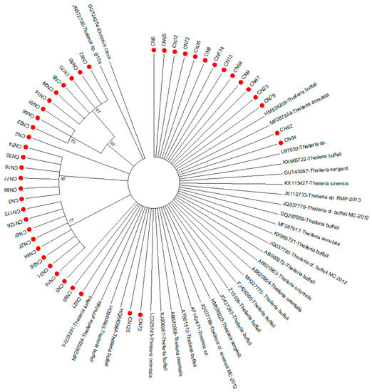 Of the 1200 DNA samples assessed for members of the piroplasms, only 44 (3.7%) samples were confirmed positive for Theileria. A homology search for the generated sequences revealed a high percentage of identity above 95% with other homologous 18S rDNA reference sequences of Theileria spp. in GenBank. Sequences CN1 and CN2 had 96.0% homology to T. buffeli gene encoding 18S ribosomal RNA, T. sergenti-Z15106, T. orientalis-AB520954, T. annulata MF287917, and T. sergenti-AF162431. Subsequently, sequences CN4, CN9,CN23, CN27, CN62, CN64,CN66, CN68, CN79, CN80, and CN174 showed a higher degree of 98%–98.9% similarity to T. buffeli (Z15106, AB520953, AY661513, HM538196, HQ840962); Theileria sergenti (GU143088, EU083803, AB668373, EU083803, HM538195); Theileria orientalis (LC325745, AB520954, HM538223, AB668373, MH503862); Theileria orientalis (AB668373, AB520954); and Theileria annulata (MF287934, FJ225392). Other sequences, CN3, CN14, CN18, CN22, CN24, CN30, CN31, CN66, CN69, CN74, and CN76 also demonstrated a high degree of homology between 91.0%–97.0% to various Theileria sp. (AP011948, HM538223, EU083803, HM538220, HQ840961, KJ806987, KY197711, XR696404, LC325744, DQ286801, AB000271, KX115426).
