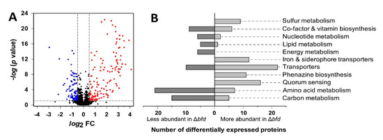 (A) Volcano plot illustrating differentially abundant proteins in the Δbfd isogenic mutant relative to the wt strain. The fold change (FC) is defined as the abundance ratio of Δbfd/wt. The non-axial vertical lines designate log2 FC ± 0.5 and the non-axial horizontal line denotes p = 0.05. Points in red represent proteins more abundant in the Δbfd mutant, while points in blue indicate proteins less abundant in the mutant. (B) KEGG Orthology functional classification of proteins differentially expressed in wt and Δbfd cells.