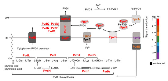 The Δbfd cells overproduce pyoverdine (Figure S1), a siderophore secreted by P. aeruginosa to assimilate iron [38]. Pyoverdine molecules are composed of three main parts, a dihydroquinoline chromophore (fluorescent), a strain-specific peptide, and a side chain stemming from the chromophore. P. aeruginosa produces three pyoverdines (PVDI-III), each characterized by a different peptide chain [39]; PVDI (PVD hereafter) is the best characterized. PVD biosynthesis, schematically summarized in Figure 3, requires numerous enzymes and non-ribosomal peptide synthetases (NRPSs) [38,40,41]. Inspection of Figure 3 shows that all the enzymes and non-ribosomal peptides involved in the biosynthesis, secretion and import of the iron–PVD complex are strongly enriched in the Δbfd cells, as indicated by the color scale. The PVD backbone begins assembly in the cytosol with the aid of NRPSs, PvdA, PvdD, PvdF, PvdH, PvdI, PvdJ and PvdL. The cytoplasmic (non-fluorescent) PVD precursor bound to a myristic or myristoleic acid chain [42] is thought to be transported into the periplasm by the ABC transporter PvdE [43], which is also highly enriched in the Δbfd cells. The maturation of PVD occurs in the periplasm where PvdQ cleaves the myristic or myristoleic moiety to produce ferribactin, which is maturated by enzymes PvdN, PvdM, PvdO, and PvdP, all significantly enriched in the Δbfd cells. The siderophore is secreted through a tripartite efflux pump consisting of an inner membrane protein (PvdT), periplasmic adaptor protein (PvdR) and outer membrane protein (OpmQ) [41,44,45]. The secreted PVD chelates Fe3+ and the complex is taken into the periplasm by FpvA in a TonB-dependent manner [46,47], where it binds to periplasmic proteins FpvC and FpvF. The cytoplasmic membrane protein FpvG is thought to reduce the chelated Fe3+, probably aided by proteins FpvH, FpvJ, and FpvK [48]. After its dissociation from PVD, Fe2+ binds to FpvC and is transported to the cytoplasm by the ABC transporter FpvDE, and PVD is recycled into the extracellular space via the PvdT–PvdR–OpmQ efflux pump. We also observe that the sigma factor PvdS, required for the expression of pyoverdine, is enriched in the Δbfd cells, whereas the anti-sigma factor FpvR, which is required to inactive PvdS, is strongly attenuated. As such, the proteomic profiles are in excellent agreement with the pyoverdine overproduction of the Δbfd relative to the wt cells.