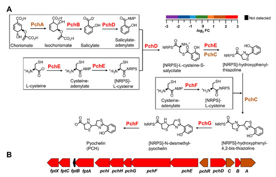Pyochelin (PCH) is a lower affinity siderophore relative to pyoverdine, which at neutral pH chelates Fe3+ with 2:1 stoichiometry. The biosynthesis of pyochelin involves three NRPS and far fewer proteins than the biosynthesis of pyoverdine. It is schematically depicted in Figure 4A where the relative abundance of proteins in the Δbfd relative to the wt cells is indicated by the color scale. Pyochelin biosynthesis starts with the transformation of chorismate to salicylate by enzymes PchA and PchB [49,50], both enriched in the Δbfd cells. Salicylate is then activated and coupled to a molecule of activated L-cysteine with the aid of enzymes PchD, PchC and PchE to produce hydroxyphenyl-thiazoline [51,52]; PchF catalyzes the incorporation of a second molecule of activated L-cysteine to form the second thiazoline ring, which is reduced to thiazolidine by PchG, before PchF catalyzes the release of pyochelin [53]. The synthesis of PCH takes place in the cytosol, but not much is yet known regarding the proteins involved in its secretion, or the import of iron-bound PCH. In this context, Figure 4B shows the organization of genes involved in pyochelin biosynthesis and function [50], colored with the relative abundance of the corresponding proteins in the proteomics data set. This representation demonstrates that all the proteins involved in pyochelin biosynthesis and function are enriched in the Δbfd cells.