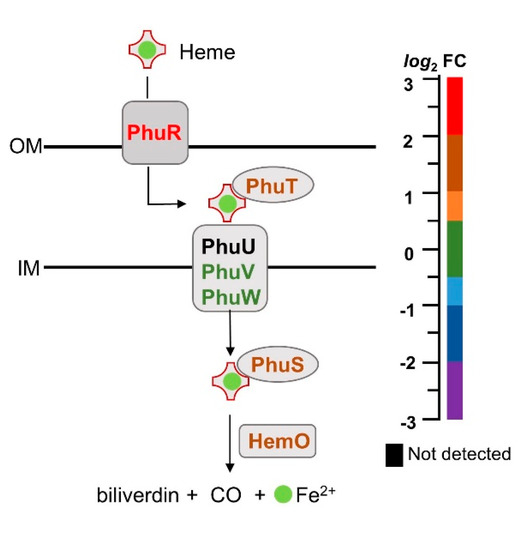 P. aeruginosa utilizes two systems to scavenge host-heme, a hemophore-dependent heme assimilation system (has) and a non-hemophore-dependent Pseudomonas heme uptake (phu) system [54,55]. Heme is extracted from hemoglobin by the TonB-dependent PhuR receptor for transport across the outer membrane. In the periplasmic space heme is shuttled by PhuT to the PhuUVW transporter for internalization into the cytosol, where it is sequestered by PhuS and transferred to the heme oxygenase (HemO) [56], which cleaves the heme macrocycle to release iron, biliverdin-β, biliverdin-δ and carbon monoxide [57]. Consistent with the iron starvation caused by the blockade of the BfrB–Bfd complex, most of the enzymes involved in heme capture, internalization and heme degradation are enriched in the Δbfd cells (Figure 5).