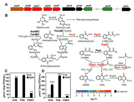 Proteins for the synthesis of AQs are enriched in the Δbfd cells. (A) Organization of the genes encoding proteins for AQ biosynthesis, and the phnAB genes, color coded according to the log2FC scale. (B) Schematic representation of the biosynthesis of AQs showing the relative abundances (Δbfd/wt) of each of the proteins in the pathway color coded according to the log2FC scale. The preparation of this scheme was aided significantly by ref [64]. (C,D) LC-MS-determined levels of HHQ, PQS, and HQNO from cells and from spent media, respectively, obtained from cultures of wt and Δbfd cells; PQS from wt cells was below the detection limit. The amount of AQs has been normalized to log CFU/mL. Means and standard deviations from three biological replicates are shown. 2-aminobenzoylacetyl -CoA (2-ABA-CoA), 2-aminobenzoylacetate (2-ABA), 2-hydroxylaminobenzoylacetate (2-HABA). p < 0.01 denoted by ** and p < 0.001 by *** relative to wt.