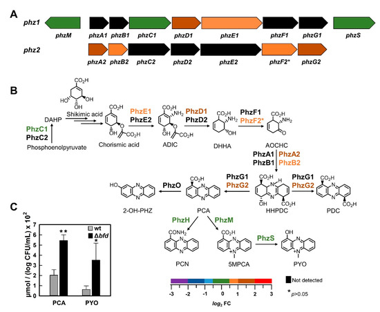 Proteins for the biosynthesis of phenazines are enriched in the Δbfd cells. (A) Organization of the genes in the two operons, phz1 and phz2, color coded according to the log2FC scale. (B) Schematic representation for the biosynthesis of phenazines showing the relative abundances (Δbfd/wt) of each of the proteins in the pathway color coded according to the log2FC scale. The preparation of this scheme was aided significantly by ref. [68]. (C) LC-MS-determined levels of PCA in wt and Δbfd cells normalized to log CFU/mL. 2-amino-2-desoxyisochorismic acid (ADIC), trans- 2,3-dihydro-3-hydroxyanthranilic acid (DHHA), 6-amino-5-oxocyclohex-2-ene-1-carboxylic acid (AOCHC), hexahydrophenazine-1,6-dicarboxylic acid (HHPDC), phenazine-1-carboxylic acid (PCA), 5-methyl-phenazine-1-carboxylic acid (5MPCA), phenazine-1-carboxamide (PCN), pyocyanin (PYO) 2-hydroxy-phenazine (2-OHPHZ). p < 0.05 denoted by * and p < 0.01 by ** relative to wt.
