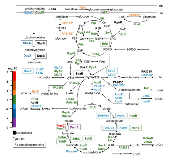 Comparing the proteomic profiles of wt and Δbfd cells shows significant differences in central carbon metabolism, which extend to the synthesis of several amino acids (Figure 8). We begin this discussion by pointing to the enrichment of enzymes involved in the conversion of glycogen to glucose (PA2152 and TreA) [72,73,74] in the Δbfd cells. Glycogen is a major intracellular reserve polymer of the α-1-4-linked glucose monomers that accumulates in bacterial cells under conditions of limited growth, and it is degraded when carbon is limited [75,76,77,78,79]. As such, the enrichment of PA2152 and TreA in the Δbfd cells suggests alterations in carbon metabolism. Previous studies comparing the metabolic flux of exponential phase Pseudomonas putida cells grown in iron replete vs. iron limiting conditions showed a decrease in metabolic flux through the Entner–Doudoroff route, as well as through Fe-containing metabolic enzymes of the tricarboxylic acid (TCA) cycle [80]. In agreement, our results show that several enzymes of the cycle are depleted in the Δbfd cells (Figure 8). Enzymes in the upper portion of the TCA cycle which catalyze the conversion of pyruvate (AcoC, PA3417) or butanediol (AcoA, AcoB, AcoC) to acetyl-CoA [81] are depleted in the Δbfd cells. In addition, the aconitase enzymes AcnA and PA0794, which depend on [4Fe-4S] catalytic centers to transform citrate to isocitrate via cis-aconitate, are also depleted in the mutant cells. In the bottom section of the TCA cycle, the conversion of fumarate to malate is probably affected by the depletion of FumA (an iron-dependent enzyme). The depletion of FumA in the mutant cells appears to be compensated by the significant enrichment of FumC1, an iron-independent fumarase hydratase, whose expression is known to be stimulated under iron limiting conditions [82].