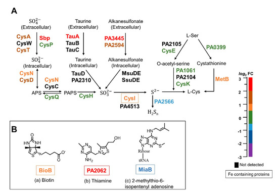 Sulfur, an essential element for bacterial life, is a component of the amino acids cysteine and methionine. P. aeruginosa assimilates sulfur preferentially from sulfate (), which is imported from the environment and reduced intracellularly to sulfide () for its subsequent incorporation into sulfur-containing molecules. A primary path of sulfur assimilation, the incorporation of into cysteine plays a crucial role in the biogenesis of [Fe-S] clusters, in the biosynthesis of antioxidant proteins and peptides, and as a precursor of methionine, coenzyme A, coenzyme M, and also thiamine, biotin, lipoic acid and the siderophore pyochelin [101,102]. Bacteria respond to sulfate or cysteine starvation by deploying the so-called sulfate starvation-induced proteins (SSI proteins), which in P. aeruginosa consist of sulfate and sulfonate transport systems for the uptake of sulfate and alkyl sulfonates, as well as sulfatase and sulfonatase enzymes, which function in the reduction of the sulfate and alkylsulfonate to for its subsequent incorporation in cysteine [103]. In this context, it is interesting that many of the SSI proteins are enriched in the Δbfd cells (Figure 11A), because it indicates that the mutant cells are deficient in sulfate or cysteine. The SSI proteins are coded by genes in the spb-containing cysPTWA operon, where Sbp is a periplasmic sulfate-binding protein, CysP is a periplasmic thiosulfate binding protein, CysT and CysW are the membrane proteins, and CysA is an ATPase. That Sbp is highly enriched whereas CysP is not suggests that the Δbfd cells are actively searching/importing [104]. The cytoplasmatic enzymes CysD and CysN, also enriched in the mutant cells, catalyze the transformation of , first into adenylyl sulfate (APS) and then into 3′-phosphoadenylyl sulfate (PAPS). PAPS is then transformed into sulfite () by the enzyme CysH, and is subsequently reduced to by the NADPH-dependent sulfite reductase CysI, which requires siroheme and FAD to function [105]. Equally consistent with a sulfur starvation response, the proteomic data indicate the enrichment of TauA (taurine uptake) and enzymes PA3445 and PA2594, which function in the uptake of alkanesulfonates [105] (Figure 11A).