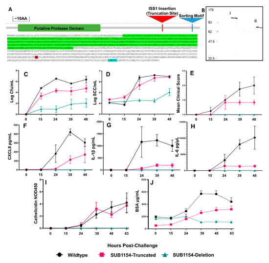 Mutants lacking the sortase-anchored serine protease, SUB1154, are attenuated in cattle [32]. We sought to characterise the role of this protein in bacterial pathogenesis. To this end, we challenged the bovine mammary gland with wild-type (WT) or previously generated isogenic S. uberis strains [32]. Briefly, a sub1154 deletion (SUB1154-deletion) genotype was obtained by allelic exchange mutagenesis, whilst a truncated SUB1154 mutant (SUB1154-truncated) was isolated from a 0140J pGh:ISS1 mutant bank as previously described [34]. The truncated SUB1154 protein lacks the sortase anchoring domain and is thus untethered from the bacterial cell surface (Figure 1A,B) but retains the putative serine protease domain.
