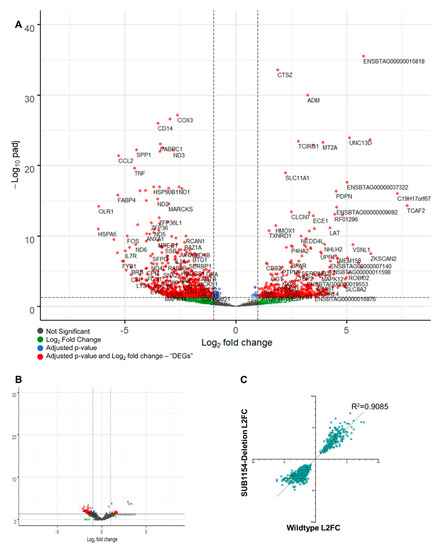Differential expression analysis (Figure 3A) detected 1052 differentially expressed genes (DEGs) with a Benjamini–Hochberg-adjusted p-value ≤ 0.05 and log2 fold change of ≥1.5 or ≤−1.5 in response to WT S. uberis 24 h following challenge; 902 DEGs were detected in response to the SUB1154 deletion strain of S. uberis. Broadly, similar changes to transcriptomes were detected in response to both wild-type and deletion (Figure 3B,C)